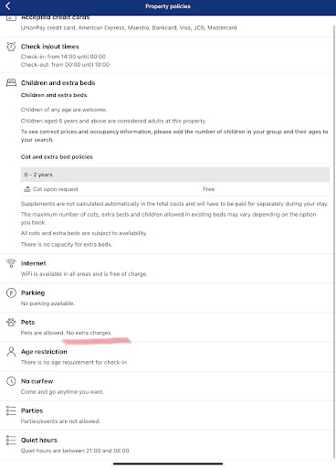 The worst experience I have ever had with hotels. We booked this hotel via Booking.com and it was written there “private bathroom”. But there was no information in the room description that this bathroom isn’t located inside the room as usually, but separately in the corridor. But the most surprising thing was that in the morning the owner asked us to pay an extra fee for our cats. In the booking description was written it’s allowed to come with pets with no additional charge. I was trying to tell him that, but he wasn’t listening. We payed him for cats and in the same moment he declined our booking on the Booking.com. I suppose he did that because of two reasons - he didn’t wanted to pay booking fee to their service and he didn’t want let us to leave a review about his hotel. This is an inappropriate attitude to guests, I think people should know about bathroom and additional payments before...