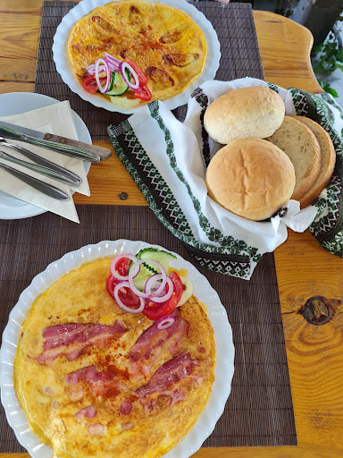 Reggelizni ültünk be. Sajnos itt is jellemző a túlterhelt kiszolgálás tünete: hiába mozognak körülötted a pincérek, esélyed sincs leinteni őket, mert direkt nem néznek az asztalok felé, illetve nem hallják, hogy szólsz. Amikor 10 perc várakozás után étlapot ajánlottak, inkább érdeklődni próbálkoztunk arról, hogy mit tudunk reggelizni (hogy egy körben választani is tudjunk) - de a felszolgálónk ragaszkodott hozzá, hogy étlapot hozzon. Ezzel a körrel szintén plusz 10 percet töltöttünk el. Szalonnás rántotta bár szerepelt az étlapon, de épp nem volt rendelhető - eközben amúgy rántotta és olyan vegyes tál, aminek az eleme a szalonna rendelhető volt - végül ezt is (Parasztlakoma néven) és egy Vegyestálat rendeltünk. Ezek ár/érték arányban kiábrándítóak voltak, egyik sem ért meg 1600ft-ot: bolti olcsó csemege és paprikás szalámi, zsíros szeletelt sajt, 2 darab zöldség, szeletelt kenyér és halvány bolti zsemle voltak a lehangoló, közös elemei ezeknek. A Parasztlakomán a sült bacon (tudom, ez nem szalonna, de azt gondolom, fel lehet ajánlani a vendégnek alternatívaként, ha amúgy szalonnás rántottát evett volna) és a háziasabb...