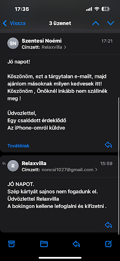 Szerencsém nem volt itt megszállni , az üzenetváltás magáért beszél!! Nem ajánlom a szállás , mert már itt is olyan roppant elegáns és intelligens e-mailt kaptam , hogy süt róla a kedvesség az emberiség és, hogy mennyire várják a vendégeket. 2 szobát szerettem volna foglalni , ajánlat kérést kértem , be lehetett jelölni a szép-kártyát és...