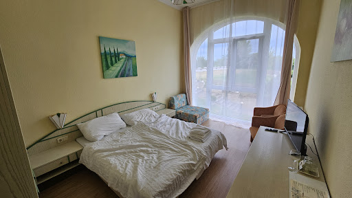 A kissé kopott enteriőrön túl is lendülhetünk, de az már gond, hogy a szobát nem lehet normálisan besötétíteni, főleg, hogy a szálló egyik kandelábere pont az ablak előtt szórja a fényét egész éjjel; ennek oka, hogy a függöny vékony és nem éri át az ablakot, legalább fél méteres hézagot hagyva. A tévé kicsi, monitor méretű, miközben a szoba egy belépő 82 centist is simán elviselne; igaz, a csatornakínálat nagyon minimál.