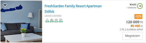 Az apartman 2 nagy hálószobából, amerikai konyhás nappaliból, fürdőszobából és különálló WC-ből áll. Az apartman 6 fő számára is kényelmes szállást biztosít, a konyhában található kihúzahtó asztalt 6 fő is szellősen körbe tudja ülni. A hálószobákban 2db 90x200-as ágy összetolva várja a vendégeket, az alváshoz többféle keménységű párna, ágynemű biztosított. A vendégeknek 2 méretű törököző kerül bekészítésre, a fürdőszobában tusfürdő, kéztörlő, hajszárító biztosított. A konyhában 6 főre elegendő evőeszköz, étkészlet, edények, mikrohullámú sütő, kenyérpirító, Nespresso kávéfőző, vízforraló található. Az apratmanhoz tartozik egy kocsibeálló a teremgarázsban, illetve egy zárható tároló a SUP-ok, kerékpárok számára. Az apartmanházban fűtött medence, infra szauna, gőzkabin is található, a zárt udvarban gyermekeknek játszótér, felnőtteknek bográcsozóhely, és óriási zöld felület található. A legekisebbek kényelmét rácsos kiságy, fellépő, babakád, bili, saját ágynemű és törölköző szolgálja. A FreshGarden Family Resortban étkezés nem biztosított, ám a közelben több strand büfé, étterem is található. A fesztiválok ideje alatt is kiváló pihenést biztosít, mivel Zamárdi és Siófoki Plázs könnyen elérhető, ám mégis csendes és zöld környezet biztosítja a regenerálódást. A közeli Sóstó a horgászat...