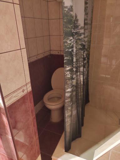 W łazience... zdemontowane drzwi które stały w głównym salonie. Sama toaleta bez światła, zrobiona dodatkowo koło kotary prysznica.