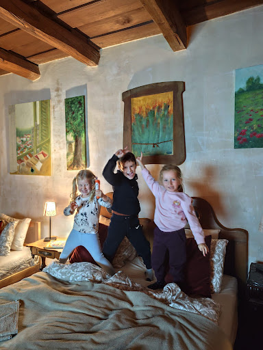 Én valahogy sohasem szerettem a parasztházakat, na de ez... Ha azt mondom, hogy mindennel fel van szerelve, akkor sem biztos, hogy indukciós főzőlapra meg mosogatógépre gondolsz, arra meg biztosan nem, mert apartmanban ilyet sohasem láttam, hogy van kávé, teaválaszték, mosogatógéptabletta, folyékony szappan, kb. 10 kilónyi (nem viccelek) legó, konnektorba dugós szúnyogriasztó és darázsriasztó spray... És közben tényleg van valami kellemes, tájba simulós hangulata. Ebben a mezőnyben abszolút öt csillag, meg még egy kicsi, mindezt nem megfizethetetlenül. Lehet, hogy még jövünk (és a "lehet" inkább csak annak szól, hogy nem nagyon vagyunk olyan vissszajarós népek).(Zárójelben, városi puhányoknak: a szomszédban a baromfiak hajnalban kelnek, szóval ne gondold, hogy nagyot fogsz aludni a jó kis falusi...