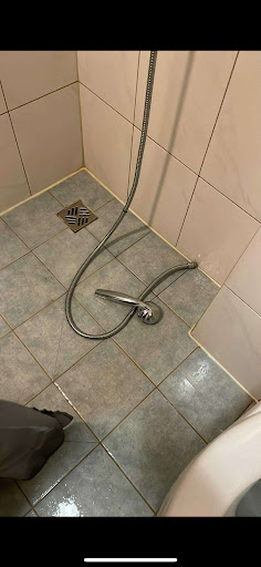 The wallpaper needs redone as is peeling in places, and the tiling in the bathroom isn't the best. There's a small gap and line marks where the flush is for the toilet. The shower needs a good clean or re-pointed as it's pretty grotty between tiles and in the corners. The shower curtain in this room has been repaired with duct tape and a cable tie which looks terrible.