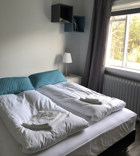 I stayed here for four nights ONLY because my positive Covid test, the day before my scheduled flight back to the U.S.A., required that I self-quarantine for five days before I could request a "Fit to Fly" Certificate to get on my return flight. Needing to quickly find a place to stay for several nights that was not too far from the BSI Terminal, I felt blessed that this place met my needs at a price that significantly less than other lodgings. Unfortunately, the number of negatives were simply too much for me to ignore. ||||Let me be clear: I am not fussy when it comes to sleeping accommodations. When I do wilderness backpacking, a roof over my head & an outhouse are luxuries for me. I knew this place had shared bathrooms but figured (correctly, I need to emphasize) it would not be a problem for me.||||First, the positives. Good location in a quiet neighborhood at a budget price. Warm, comfortable beds. Very clean rooms, including all common areas. Excellent wifi. Spotless kitchen had more utensils than I expected, with plenty of refrigerator space for your food; thus allowing you to save on meals. A hair dryer was in the room.||||Negatives.||Unless you are walking along the Snorrabraut sidewalk, with a good idea of where this place is -- it's right behind the bus stop, BTW -- you'll never see its sign. With a lack of street signs in the area, I can't say I'm surprised I got lost trying to find the place.||There is no elevator; it was not fun to carry my suitcase up a flight of stairs.||Check-in was not till 3pm, and there is no place to safely store your luggage. I've gotten used to mid-afternoon check-ins, but having to sit around till then is also not fun.||My room was supposedly designed for four people, but I see no way for more than two people to not trip over each other.||The paint on the white table was clearly coming off, and any attempt to move it resulted in its legs falling apart.||TV had ONLY Apple TV, meaning you must pay extra for anything you wanted to see. I enjoy watching news & free entertainment, but this was literally impossible.||The washing machine was broken while I was there. ANY ability to do laundry is a nice feature, and getting it free is a real treat. But not if it's unusable.||My room has radiator heat, meaning you have two choices: lots of heat or none at all.||||I must state that my biggest negative was lack of communication about getting a room key. All I got was an email message stating "Front door: xxxxxx" and "Room code: xxxxx". I've spent a lifetime training people how to use technology, often after I had to teach myself because of bad instructions, so I'm pretty good at figuring out how to get things to work. And I had no problem getting in the front door. But getting my room key took me almost fifteen minutes because there was nothing more about unlocking the box beyond the above words. I shouldn't have to email a request for instructions when I arrive at a lodging; they should be available before or at arrival.||||And I never was informed what to do when checking out. Put the key back in the lock box? Leave it in the room? Leave it in the door?||||Similar lack of instructions on how to use the TV -- I was able to figure this out, even if I concluded that I didn't want to spend $3 to watch 30 minutes of TV. And the dial to get heat from the radiator also had no instructions. Or the dishwasher. Or the laundry room. ||||Yes, I could -- and did -- use email to get answers. But writing out a list of instructions for download would have been a far better choice.||||If you're a small group who prefers budget lodging without much in the way of help on how to operate things like getting your room key, this is an excellent choice. But if you need a little more, be aware of the potential pitfalls...