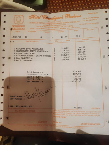 Chandigarh beckons use to be my most favourable place for any celebrations whether that is bday, anniversaries or any parties. But from the last two visits specially the last visit, the quality of the food has got worsen. Initially, it use to be the less of salt or it may be very spicy. But during my last visit on 12th May, table no 14, I think the bill no is 606. I have first ordered Manchow soup which was just a boiled water with chopped vegetables in it, I ignored it. But than came the main course which included Chinese i.e. noodles with NO/zero salt, half cooked and Cheese chilly with gravy where the gravy was so waterish that I pour it in my plate to have and my entire plate was like somebody has added water to my serving. It was again without salt and spice and was half cooked. I got annoyed and ask the manager what's wrong and he called up the chef to whom when I showed noodles and cheese chilly, the chef was kind enough to admit they were not good at all. And offered noodles to be made again and serve hot which I rejected, but they took my cheese chilly and took out entire watery gravy and gave me only cheese + onion+ big pieces of capsicum in the bowl with not even a single drop of gravy. I was with my family- my father, mother both denied having food anymore and left inbetween. Me and my wife somehow finished the meal. However the big was that I was charged for cheese chilly with gravy or watery gravy, which was not served to me. It was looking like they just wanted to get over it and serve anything. I look forward for a valid response from the hotel on this. If the quality is going to be degraded like this than I would suggest everyone to please be careful when you go next. Do not eat for the sake of having anything - REMEMBER YOU ARE PAYING FOR WHAT YOU EAT! Attached is the bill...