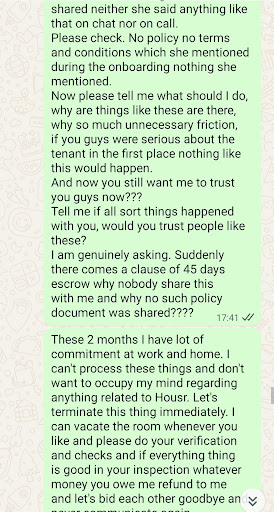 This is a detailed review about how these people torture you. They booked my room and took rent and deposit. They did zero documentation ans orientation except some little information passed on by the guard. I shifted to the room found that the AC was not working, I contacted 3 people including the property manager Ayush. They said we will shift you to new room for a day and fix your room. I have their word. The next day they cut the electricity of this new room at 6AM. I conveyed and here comes the first apology. Anyway I went to my office and this Ayush guy gave me word that your own room AC will be fixed. I came back at night to my room and AC was exactly in same condition, frustrated I called Ayush, seeing my frustration Ayush should have been considerate instead he started blasting that I myself have checked the AC fully working, I was shocked. I decided this guy is good for nothing as I have never actually found him on the premises, this property is left to run on the confidence of the guard who being a nice guy have 0 authority and contacts. Anyway I ring their cluster manager Udyalka, she said let me see what went wrong, 10 minutes later she called me again that AC is not working because it has no Gas. This made me so angry because Ayush particularly mentioned he himself checked and did everything. And then came the wave of Second apologies. 1 week passed and then I was coming from outside Delhi and reach at 4am in my room, turns out that there is no electricity, I reached out to guard, poor guy try ringing this Ayush and others, nobody helped him. Then I tried calling Ayush put his phone switched off at night seems like, his sleep is more important being a property manager never present on the premises. For an hour I was roaming on the streets try ringing everyone. Then somehow I got some contact in totally different Housr property and he helped me and he told me your electricity credit is in negative, I was like what??? Nobody ever ever mentioned this to me. He helped to fix that and 2 hours later finally I could go to sleep. Next morning Ayush magically appears and apologised for the 3rd time and guess what, he tried to blame on me that I was never found on the property and hence he couldn't tell me about this electricity thing with a straight face. That day I decided I am living at a place run by highly incompetent and frauds. I communicated almost like mid way in the month that I will leave at the end and you can adjust the deposit. But but but here comes the last bomb, Ayush told me no you pay the rent and your deposit will be transferred to you after 45 days of your exit. Again I was shocked. I asked him to produce any document any whatsapp chat mentioning this. And this vile creature silently triggers mesaage on Housr whatsapp and emails to complete my onboarding and upload aadhar and all after like a month of my stay, these messages were never ever delivered. I have never ever seen such incompetent and irresponsible people ever in my life. I decided to leave the property, after consulting my cousin who is an advocate in Delhi Hight Court immediately regardless of what they owe me. I have all the whatsapp chats of their 5 apologies within 2 weeks.