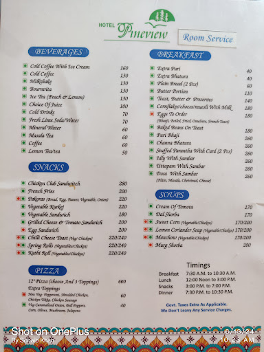 Read moreWe visited Hotel Pineview for the kashmiri food festival they've been hosting in collaboration with Chor Bizarre. We ordered the following dishes - Bhindi yakhni, nadru palak, kashmiri seekh kebab, goshtaba, methi maaz, Kashmiri phirni and kahwah. I've had kasmiri food before and was led down by the below average food served. Goshtaba -The meat balls in goshtaba were terribly firm and tasted odd, the gravy also wasn't great. Kasmiri seekh kebab - seekh kababs made out of lamb are supposed to be juicy tender and moist instead they were firm, dry and chewy. Methi maaz - couldn't taste any Fenugreek in the dish. the dish is supposed to compromise of tripe, intestine and small chunks of meat and all we were served of masala. Nadru palak - an average preperation with hardly 4 to 5 pieces of nadru and a lot of masala Bhindi yakhni - the only dish that tasted how it's supposed to and the only reason the review deserves a single star Kahwa - the biggest joke of everything that was served to us, cheap kahwa in tea bags taste better than what we had. No taste of safron or any spices. Phirni - just average.