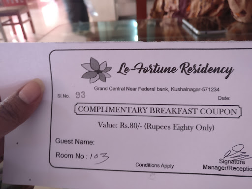 Read moreWe stayed at Le Fortune for a night. The rooms weren't ready when we checked in, so had to wait, but the manager gave us a temporary room for the time being, which is a common practice. The rooms were quite decent, right amount of light, spacious & comfortable beds with clean bathrooms. Towels and toiletries were provided when asked, but should have been already kept, a small mismanagement on their part. The hotel is located in the prime area of Kushalnagar and most of the tourist places are pretty close by, except some, that are 30 Kms far from the city. The breakfast was delicious, more variety or options should have been present, but that's okay according to the costs of the room. The manager was good and attended to our needs properly. Overall, I would say, a good stay of 3-4 days would not be a problem...