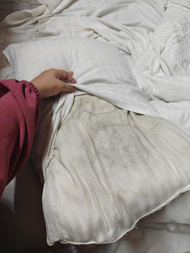 The condition of the villa was appalling. The walls were stained and crumbling in places, the couches were sticky and visibly grimy, and every appliance in the kitchen was coated with layers of grease. The bedsheets and cushions smelled of mildew and had visible mold patches — we even found spots of fungus growing. It was truly unhygienic and borderline unsafe.