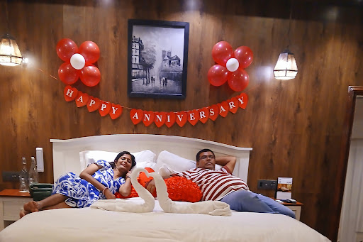 The room was beautifully decorated with balloons, "Happy Anniversary" cards, and a cozy celebratory ambiance. To top it all, Pawan had arranged a delicious anniversary cake for us. Later in the evening, during the live singing session, the singer announced our anniversary and even dedicated a romantic song to us. We cut the cake together and enjoyed a sumptuous dinner—a truly unforgettable evening.