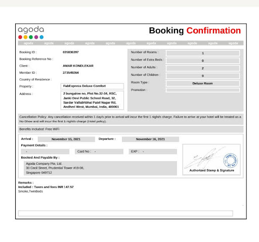 Yest monday 15.11.2021 i booked room online on agoda.com of hotel fab express deluxe comfort andheri west for one night for 2 person me n my dad (hospital purpose)