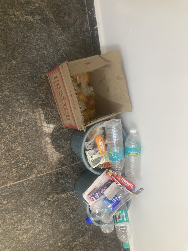 The washroom was dirty and unhygienic, filled with used shampoo packets, innerwear, and other trash.