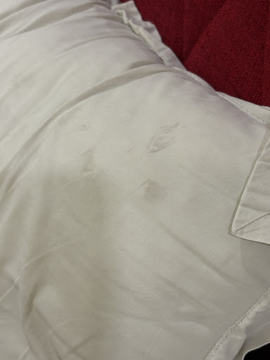 Unclean pillow cover and towels provided.