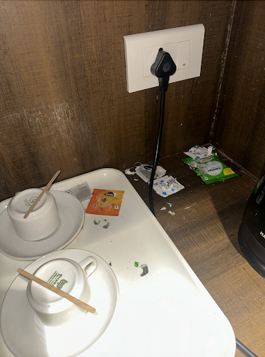 We found a RAT in our room. It had chewed through tea, coffee, and sugar sachets and even left droppings in the bathroom (photos attached). I reported it to the front desk, and they offered to move us to another room on the same floor. It was already 11 PM, and although we were extremely tired, we decided to move rooms. Trying to find a different hotel at that hour just wasn’t realistic.