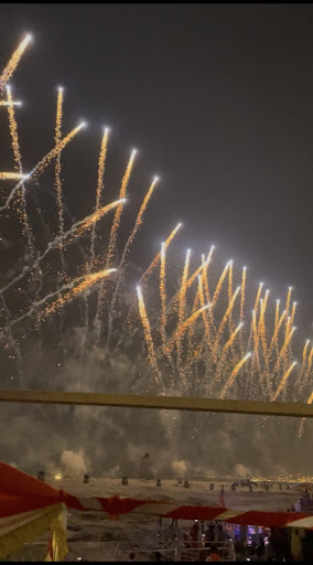 The Aarti wasn’t shown at all, the laser show was from so far away that we could barely see anything except a few dull lights, and the firecracker show , forget it! The boatman straight up refused to take us near, started turning back, and only after constant arguments did he stop near Prabhu Ghat, giving some lame excuse that no other boats were allowed there.