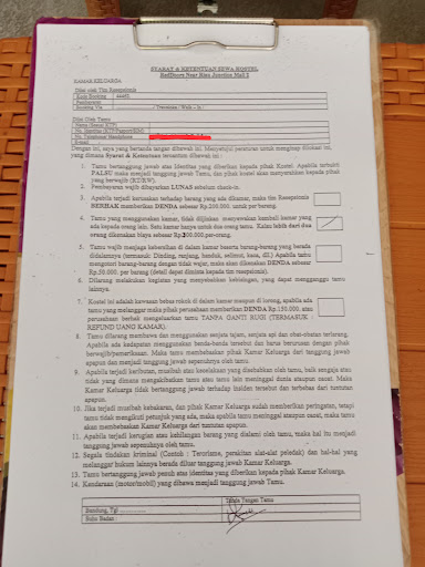 Hari H tiba mau check-in yang ngelayani mas2, tanpa perlu deposit cuma ya tahan ktp/sim sama dimintain nomer WA, ditawarin juga mau kamar atas atau bawah karena ngeliat saya hamil mungkin biar ga capek naik turun tangga, semuanya lancar. Pas masuk kamar kecium wangi seger abis dibersihkan, memang kamarnya sempitt tapi kami ga mempermasalahkan karena yang penting nyaman buat istirahat. Saya coba cek kelengkapan lain, ternyata disediain 2 botol air minum, 2 sikat gigi 1 odol, sabun mini, 1 handuk, dan 1 selimut. Saya cek ac juga karena udah su'udzon liat review katanya panas pengap cuma kek kipas, tapi ternyata ac nya berfungsi kok malah dingin banget cuy. Terus alhamdulillah nya kasur dan bantalnya bersih ga bau. Kamar mandi aman ga kotor, ga ada rambut bekas orang atau hewan2, cuma untuk water heater keknya harus tau cara pake/ngakalinnya dan bisa kok berfungsi. Di lemari juga ada tempelan kertas nomor yang bisa dihubungi kalo butuh sesuatu dan tentang biaya denda barang yang dipakai kalo terjadi masalah. Oh ya kalo keluar di atas jam 12 malem gerbang memang sengaja dikunci, tapi tenang aja ditempelin nomor pin di kunci kamarnya. Cuma hati2 agak effort ya kalo ternyata kekunci bagian bawah sama dalemnya, tangan kalian harus masuk buat geser buka kuncinya, tapi alhamdulillah bisa diatasi sendiri. Satu lagi, ternyata kalo misal mau memperpanjang juga bisa, 1 jam nya 20rb.