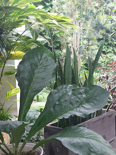 Ruangan makan bersama tersedia di teras terbuka dengan penataan yang bagus dan indah, sekali lagi dipenuhi tanaman hijau yang menyegarkan mata. Sarapan pagi diantarkan ke masing-masing kamar, namun boleh untuk menggunakan ruangan makannya. Nasi goreng yang disediakan sangat enak rasanya, dilengkapi dengan 2 potong semangka yang manis.