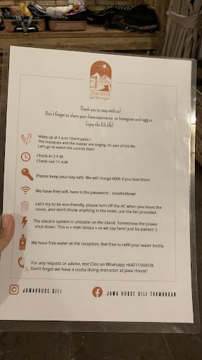 Read moreJawa House exceeded our expectations. The pictures online look great but donât do the hotel justice, in reality this place is exquisite. The interior in the room was out of this world, we were completely in awe when we were shown where we would be staying. The rooms are spacious and clean with all that you could need and more. The bed was extremely comfortable and we had an amazing nights sleep. The staff were so friendly and accommodating, made us feel right at home. We checked out very early the next morning, and the staff were very helpful and attentive. WiFi was faultless, the best connection we had got on the island. Everything was just pristine, no limescale or dust found anywhere. Free bike rental (had some of the most well kept bicycles we had seen on the island). Overall, a beautiful establishment with amazing staff. We would definitely stay again if weâre ever in the Gilis and would 110% recommend to stay here. How this is only a 2 star establishment I do not understand. This definitely needs to be reviewed!! |The only negative thing about this hotel is that on the online map the location is very different to where the hotel actually is. We got lost trying to find it, as it was another 15 minutes walk away from where it suggests online. However, a friendly local helped us locate the hotel.|(Unfortunately I didnât take...