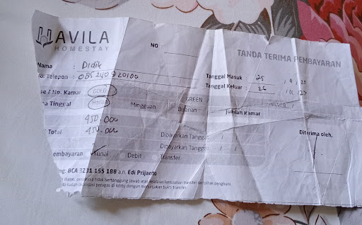 Pernah punya pengalaman tidak menyenangkan di Havila Homestay ini, waktu itu saya punya hajat peresmian masjid wakaf dan mengundang adik dan keluarga dari Madiun untuk ikut menyaksikan acara peresmiannya. Pagi sekitar jam 9 saya datang ke Havila untuk boking 2 kamar dan langsung saya bayar lunas Rp. 450.000 , eh malam nya adik saya ditagih sama petugas resepsionist (cowok agak tinggi umur kurang lebih 30 tahun an), dengan alasan belum dibayar kamarnya. Cowok itu ngotot terus meminta pembayaran. Adik saya menjelaskan ke petugas resepsionist itu bahwa kamar sudah dibayar sama kakak. Untungnya adik saya langsung konfirmasi ke saya, langsung saya kirim foto kuitansi via WA, coba kalau adik saya secara diam2 membayar dan tidak konfirmasi ke saya pasti kita akan dirugikan oleh petugas resepsionist itu. Menurut saya ada unsur kesengajaan dari petugas resepsionist itu utuk mencari keuntungan pribadi. Yang saya herankan petugas resepsionist itu pongah tidak merasa bersalah dan tidak mempunyai itikad baik untuk meminta maaf atas kesalahannya. Dan saya kapok tidak akan pesan lagi kamar di Havila...