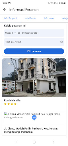 Harusnya hari ini nginep disini, udah booking dari jauh-jauh hari tanggal 12 desember nama unit ROADSIDE VILLAS, di charge CC tgl 24 desember booking di agoda. Selang beberapa hari kok namanya berubah jadi ROADSIDE VILLA ilang huruf S-nya, dicuekin aja kirain kaga ngaruh apa2 kalo namanya berubah. Ternyata pas pagi 27 desember chat wa ke admin malah bilang ga ada booking-an, akhirnya minta dibatalin aja ke Agoda. Duitnya balik tapi terlunta-lunta di Dieng ga dapet hotel karena peak season plus booking udah mepet. Itinerary jadi berantakan. Sampe jam 3 kaga nemu hotel pengganti. Semoga ga kejadian sama tamu lain. Buat yg udah booking di OTA mending bolak balik konfirmasi ulang biar ga ngalamin kejadian kaya gini juga...