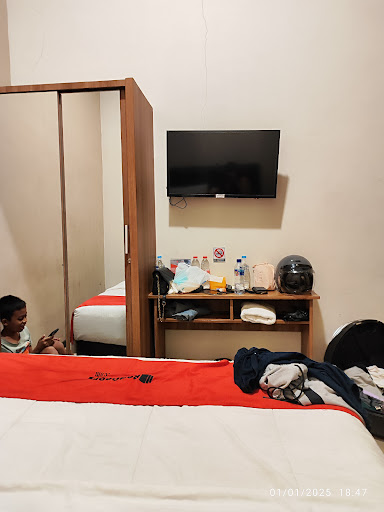 ย ย ย Read more๐ : Kamarnya bersih, wangi, kasurnya empuk, selimutnya tebel, AC lumayan dingin, dikasih 2 botol air mineral 600 ml, dikasih bantal gede 2 + bantal RedDoorz 1, dikasih handuk 2, dikasih alat mandi (2 sikat gigi, 1 pasta gigi kecil, trus satu botol kecil yg bisa dipakai buat sampo, body wash, dan kondisioner sekaligus. TV-nya layar datar, channel banyak dan suara jelas. Ada selambu buat nutupin jendela. Ada meja dan kursi, tersedia kotak tisu. Ada lemari buat naruh pakaian dan barang.