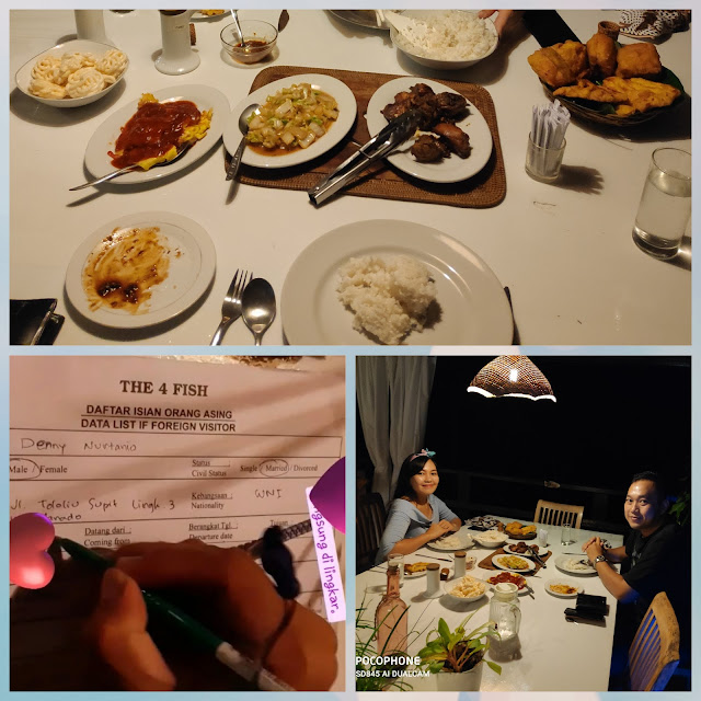 I arrived alone and was joined by a friend after a few days. I had two different rooms (before and after four nights in other places). Both were quiet, super clean, and opened onto a sturdy, breezy deck. There are also rooms at the lower pool level, which my friend enjoyed. One ofmy rooms had an A/C unit that could have been activated for 40,000 rupiah per day (cheap), but I was fine with the ceiling fan.||||While by myself, I bird-watched and snorkeled. I walked about a quarter mile to a channel through the mangroves and had the beach pretty much to myself. There are a few easy-to-enter snorkel sites in walking distance, where I felt safe to swim alone. There is a lovely reef and a sandy harbor. The beach is basically a bit of sand over a thousand years of broken coral, so it's better for shell-hunting and walking rather than lounging.||||The 4 Fish is in a residential area and subject to the activity of a village: motorbikes, construction, roosters, kids playing, etc. Because the guesthouse was so homey and comfortable, I wasn't disturbed by the activity; it felt like I was part of the community. I tend to be fussy about noise, so I guess this is evidence of the relaxation I felt in Sulawesi. There is a warung next door where I had a good lunch of noodles and stuffed tofu for well under a dollar. I saw other warungs on my walks but didn't try them.||||The hosts, Ineke and Jan, are mostly available at breakfast and dinner times, but show up on errands at other times. They are cheerful and patient, generous with advice and assistance. They are also polite to their employees. Breakfasts were similar to what I'd eat at home (toast and egg), but dinners had a soup course, a selection of vegetable and meat dishes, and a dessert. The food was well-prepared and pleasantly varied.||||Many excursions are available. In hindsight, I enjoyed spending two nights at Tangkoko, but wish I'd had the 4 Fish arrange day trips to Bunaken for me instead of staying on the island. My friend and I rented their motorbike to explore the region and we had a great time on smooth new roads.||||I look forward to...