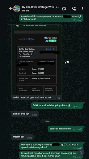 Read moreHati-hati kalau booking di hotel ini. Saya book hotel ini di tgl 6 Jan melalui traveloka, sudah terbayar, dan sudah issued vouchernya di traveloka. Untuk lbh memantapkan lg terkait bookingan saya di traveloka, di hari yg sama (6 Jan) saya konfirmasi lgsg ke pihak hotel melalui WA, dan pihak hotel SUDAH KONFIRM bahwa pesanan saya sudah masuk di sistem mereka. Nah, tgl 11 Jan saya iseng buka traveloka, pas ngecek tiba-tiba ada pengajuan refund hotel (tertulis pengajuan tgl 9 Jan) yang jelas-jelas saya tidak melakukan pengajuan refund tsb. Langsung saya konfirmasi lg ke pihak hotel via WA, dan benar dr pihak hotel mengajukan refund sepihak TANPA KONFIRMASI apapun ke saya dg alasan tipe kamar yg saat itu masih bisa saya pilih di traveloka sudah full sejak Desember. Kl memang full booked, kenapa baru diajukan refund di tgl 9 Jan (dg kondisi voucher sdh issued dan pihak hotel sudah konfirm di tgl 6 Jan). Sangat...