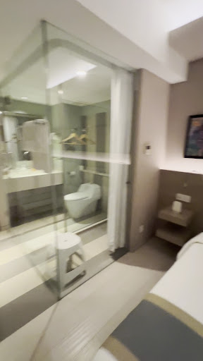 Bathroom: The bathroom is very cramped and small in size. It has glass wall and a curtain to get some privacy, not very ideal. The bathroom door opens in the room which is also tough if someone is there. The fittings are modern, water pressure on the ground floor was nice. Basic amenities and toiletries are provided on hotel packing.