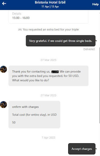 We had a reservation for three persons and had specifically requested three single beds. This arrangement was confirmed in writing, with an agreed extra charge of 50 USD (please see the attached photo for proof). However, upon arrival, the hotel staff had no knowledge of this request.