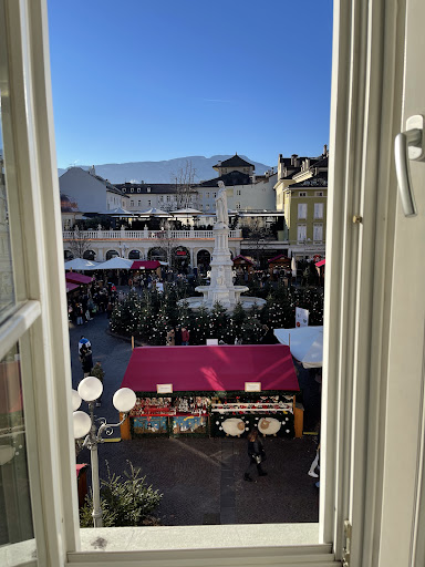 The location on Piazza Walther is a walkable distance from the Bolzano-Bozen train station. The staff is a delight and eager to help. For those with bags: there is an elevator but there are steps to negotiate to get to the elevator la ding in the lobby. Plush terry flip flop slippers and bath robes are provided. Even a room umbrella is provided for the duration of your stay.