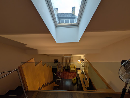 A notable design plus is that the refrigerator is cleverly placed in a matching cabinet at desk level-not inconveniently on the floor like most places. The contrasting wood floors are lovely, and the rooms are well lit from a number of sources, which you can control