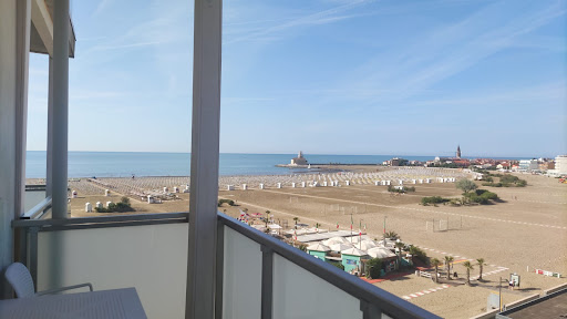The room was small , I think this was the smallest room ever where I slept with my family, It takes time to moving away before anybody tries to move in the room. It was opened to the back of the hotel where some machine murmurred all day but this were quiet with closed doors. The staff is very kind and helpful, they solved all of our problems. They suggested to use the free parking places int he city instead of using the hotels parking pleace and it takes to 5 minute to reach our car where we can found free places except Saturday, and the leaving was difficult, because the road before the entrance is crowded and my family have to wait with the packages until I pick up the car. The view from the balcony on the top was very nice The hotel are at the beach, but the beach is very long, it takes minutes to reach but we can use the hotels sunbeds. You can bring your own ones and use them on the beach between the water and the sunbed rows, but using the hotels one is easier. The sea is very shallow, you have to take a long way to reach a place where you legs aren't reach the sand.