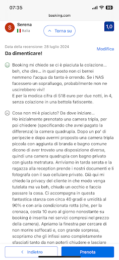 Read moreProseguo a recensire questo “alberghetto” qui perché booking non dà la possibilità di rispondere ai commenti dei proprietari. Innanzitutto non è vero che il cambio è stato chiesto a 2h dall’arrivo ma bensì il giorno prima, cioè venerdì, alle 9 e mezza del mattino, quindi con tutto il tempo per poter organizzare la struttura (come peraltro dichiarato dal signore che risponde al telefono). In caso di confusione posso mandarvi copia del registro telefonico, magari il troppo caldo in struttura vi annebbia la mente. Il check in non è avvenuto in tarda nottata ma bensì alle 22.15 come indicato in fase di prenotazione e come da voi accettato (abbiamo tutte le mail di conferma da parte vostra). La receptionist che manda le foto dei documenti d’identità via whatsappa alla signora Stella è il vostro modo di scansionare i documenti sul server? Non mi sembra un modo molto regolare ma a questo ci penseranno le autorità competenti. Il parcheggio interrato ci è stato sconsigliato, al contrario di quanto ci scrivete in riposta a Booking, proprio perché talmente manomesso che non è accessibile a tutti i clienti. Il cambio camera è stato fatto si, con 150€ di differenza che abbiamo saldato all’arrivo e per il quale abbiamo dovuto insistere per avere la ricevuta fiscale; non credo sia una pratica così legale ricevere soldi in nero e storcere il naso di fronte al cliente che chiede conto di questo. Vedendo le risposte ad ogni singola recensione vi dico che forse dovreste leggerle meglio le segnalazioni perché di spunti per poter migliorare ve ne sono stati dati a bizzeffe ma è l’umiltà e la capacità di dire “ho sbagliato” che poi fanno davvero la differenza, non il negare l’evidenza e inventarsi fatti pur di far passare l’ospite come la parte errante. Non vi è venuto il dubbio che, se su 10 recensioni 9 sono negative e 1 sola è discreta, magari non sono gli ospiti ad essere folli ma siete piuttosto voi ad essere nel torto? Allego reportage di recensione booking con risposta truffaldina del...