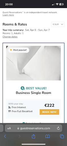 Later in the day, I was looking online and noticed on the hotel website that a business room for that night was 222€! With breakfast! When I questioned the front desk about this, and after a long wait (again), I was told they had made a mistake and that this would be brought up to the manager the next morning, and that I “should” be refunded 40€ (which is still more expensive than the hotel website, especially given the amount of time “waiting” at this hote!.)