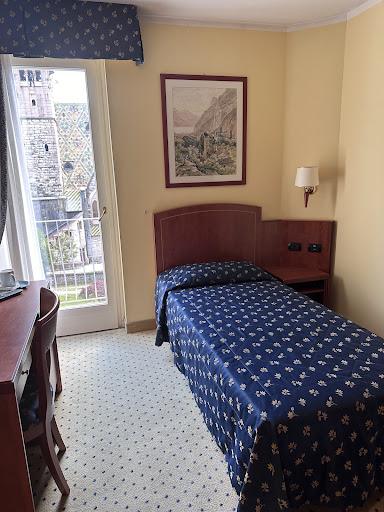The single room was very clean, spacious, and had good air conditioning. There's a mini-fridge in the room (though it's more cool than cold). The bed was really comfortable, and even had a top sheet (which I've found rare in Europe). Nice view from the balcony of the church next door and the mountains.