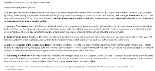 While Hilton customer service eventually stepped in and helped resolve some of the issues, the overall experience was exhausting and unpleasant. Even the letter of apology from the manager was complaining instead of realizing her mistake (see the last picture, red is my response). The failure to address the problem promptly, along with the dismissive attitude from the hotel manager, made the stay far less enjoyable than it should have been.