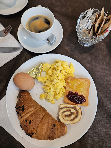 The breakfast was delicious and had everything you needed to start your day (eggs, croissant, yogurt, jam, cereal , toast, juice , sausage)