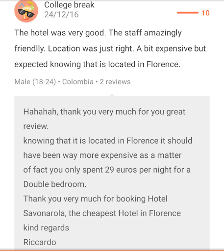 We picked Savonarola based on reviews, cost and location.||Our room (57) was a triple room with small en-suite shower/bathroom.||Room is very spacious with TV and AC - very comfortable.||We included breakfast and it is good value at €5 with fresh coffee (unlimited), tea, cereals, bread, ham & cheese plus jams and honey.||The location was fine for us (a late 50's active couple) with 10 minutes leisurely walk to San Marco and Piazza Duomo area and further 10 minutes to Uffizzi / Ponte Vecchio.||The hotel's area is quiet and we always enjoyed a good night sleep.||The staff/owners are excellent - we had most interaction with Leonardo & Mariana and they were great with advice and recommendations.||Finally at night we enjoyed a glass of house wine at the hotel bar with always great music taste (jazz, blues,...