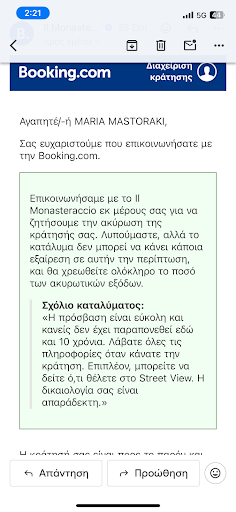 Read moreΚατά τη διάρκεια της οδικής μας περιήγησης στην Ιταλία, κάναμε το λάθος να κλείσουμε το συγκεκριμένο ξενοδοχείο έξω από τη Φλωρεντία. Ο δρόμος είναι ανηφορικός, τρομερά στενός, με φράχτες και από τις δυο μεριές, διπλής κατεύθυνσης, που δεν χωρούσε δίπλα από το αυτοκίνητο μας ούτε ποδήλατο. Δεν μου έχει ποτέ ξανά τύχει τόσο δυσπροσιτο "ξενοδοχειο". Συνήθως, οι σωστοί ξενοδόχοι ενημερώνουν από πριν για το μειονέκτημά τους. Αντιθέτως ο αγενεστατος ιδιοκτήτης μας επέπληξε που δεν είχαμε μπει να το δούμε στο googlemaps, κράτησε κανονικά τα προπληρωμενα χρήματα και για τις δύο μέρες, ενώ αμέσως εμείς ακυρωσαμε την κράτηση, και δεν παρέλειψε να μας εξυβρισει σε mail, όταν τολμησαμε να ενημερώσουμε την ιστοσελίδα κράτησης για το λόγο ακύρωσης της διαμονής μας. Θα είναι η χειρότερη ανάμνησή μου αυτό το απαραδεκτο "ξενοδοχείο". Ευτυχώς, "κάθε εμπόδιο για καλό", αμέσως μετά βρήκαμε πολύ καλύτερο ξενοδοχείο και πολυ...