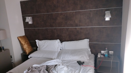 We stayed one night at this hotel which is located right in front of the Gallarate train station. On the same side there is a small shop of African and Asian products. I was afraid of hearing the noise of the train, instead, at a certain time they no longer travel and, before, nothing or little is heard, the windows have double glazing, and there is an electric shutter. The room with two beds is smaller, compared to how it looks from the photos, but comfortable for two people and for a few nights. The flat-screen TV is positioned in my opinion too high, forcing you to keep your neck in tension to look at it, it would be just a few centimeters below, instead of the immense painting. There is a small table with snacks, a wardrobe with a sliding door, extra blankets, lots of lights and unfortunately the TV light on stand-by which I couldn't turn off and who bothered me all night, maybe I could have called the lobby, but I was too sleepy to do so. The bathroom was clean, large, with double roll of toilet paper, soap and shower shampoo, several freshly laundered towels. The radiators are adjustable. It was very hot. There is wi-fi but I did not use it because there was a problem with the optical key, in fact I could not open it and the lobby clerk went up to let me in, only then he took via the "key" and password was written there. But it does nothing, I didn't need it. The room was on the third floor and next to the elevator there is a distributor of drinks, water and snacks. Great breakfast, sweet and savory. Jams, biscuits, cakes, cheeses... He immediately called us a taxi and we went to Malpensa fairs, 8 km = 14 euros...