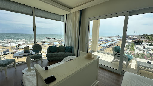 Read moreUn hotel che assurge all'alta categoria, con suite eleganti e di ottime dimensioni la cui chicca è rappresentata dal giardinetto (o terrazza) esterna arredate e dirette sul mare o sul parco piscine.|Posizione fronte spiaggia comodissima, ampio parcheggio, wi-fi potente, servizi molti interessanti a partire dall'ombrellone con lettini compreso nella zona della spiaggia denominata terrazza sino all'entrata al parco termale dotato di diverse piscine tra cui una zona bimbi che per i piccoli è il paradiso.|Va detto che per il livello del resort sarebbe preferibile poter usufruire di una piscina ad uso esclusivo degli ospiti, inglobando la fatiscente ed ingombrante struttura attuale Kursaal e con una riqualificazione della stessa, si potrebbe creare lì una terrazza con piscina che renderebbe la proprietà davvero unica.|Colazione e cena buone, chef di cucina preparato e menù interessante, peccato per la zona del beach bar in cui purtroppo il servizio era spesso approssimativo e in affanno.|La Spa è vecchiotta ma ho saputo che da poco è stata inaugurata una nuova zona con sauna e piscinetta interna che parrebbe molto bella.|Prezzi alti, soprattutto considerando la media di Lignano ma con buone offerte in particolare tramite canali ufficiali.|Pur con margini di miglioramento, il Riviera Resort con la sua freschezza, il concept all suites e gli ottimi servizi rappresenta una novità di rilievo in una Lignano in cui le strutture sono spesso risalenti nel tempo e con un gran bisogno di...
