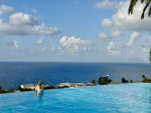 The walk to the beach is about 10 mins but does involve plenty of stairs. It’s not hard at all if you’re in good shape, but just want people to know that. The hotel rents out its own scooters and has its own boat which is very convenient. We did rent a scooter but didn’t do one of their boat rides. Instead we did an 8 hour boat tour through Salina Relax Boats that left from Santa Marina Salina. It was $75 and was amazing. We swam at Panarea, went onto Panarea for an hour, then swam at a small island near Stromboli and finally watched Stromboli erupting.