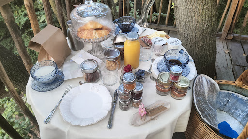 Read moreUn alloggio che puntavo da tempo immemore ma che non ero mai riuscita a prenotare... E finalmente questa volta ci sono riuscita! Le foto sul sito e sui social rendono in parte la magia e l'atmosfera che si respira qui, a partire dall'ingresso: accanto al cancellone, una buca delle lettere dove troverete una lettera, legata con fiori freschi, con le istruzioni per entrare nel magico mondo... Si lascia l'auto e si percorre il sentiero nel bosco, accompagnati da dettagli deliziosi qua e là (porticine delle fate, statuette di ranocchie, casette degli uccellini...), costeggiando il roseto e un percorso sensoriale, da fare rigorosamente a piedi nudi, per arrivare poi alla Casa sull'Albero... La nostra era la "Quercia", l'albero maestoso che faceva da base, le lucine che percorrevano tutto il corrimano e il tetto, poltroncine e tavolino nel terrazzino, visuale sul bosco circostante... Dentro, una cura incredibile dei dettagli, profumo di legno, fiori freschi, bigliettino di benvenuto, acqua fresca, bagno completo di tutto... La stanza secondo me è adatta a una coppia, c'è un mini soppalco con letto a una piazza ma è molto sacrificato come spazio (e anche un po' claustrofobico a mio avviso), è pensato per un bambino ma non troppo piccolo (non c'è protezione)... Per la cena si può scegliere se ordinare qualcosa con consegna a domicilio (i proprietari eventualmente possono dare qualche consiglio) o uscire, noi siamo rimasti sul terrazzo della Casa per goderci lo spettacolo e la pace della natura... La ciliegina sulla torta è senza dubbio la colazione, che nei mesi estivi viene servita direttamente nella Casa sull'Albero, mentre in questo periodo bisogna recarsi nella Serra in mezzo al bosco. Due tavolini (uno per ciascuna Casa) con un cestino di vimini con parte termica, e ogni ben di Dio possibile: dalle bevande calde (tè, caffè, latte), succo di frutta, marmellate, burro, salame e formaggio, miele, briosches fresche, frutta secca (noci, nocciole, mandorle), fragole fresche, frutta disidratata, Krumiri, cioccolato... Intelligente l'idea di lasciare dei sacchettini di carta per portarsi via quello che eventualmente si avanza. Voto 10 e più, anche per la cortesia e disponibilità della proprietaria, con cui ci siamo fermati a scambiare due chiacchiere prima di ripartire, e che ci ha raccontato la storia della sua Attività e svelato...