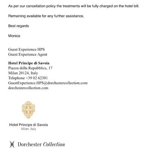 However there was no email or note the day before to remind me of the service, therefore allowing me to realize and adjust my schedule. Just an email on the day stating āyou didnāt show up for the treatment so youāll be charged full priceā Full price, really. When you couldāve even called to remind me when I didnāt arrive 10 minutes in. Iād have gone to the spa in 4 minutes, itās a 3+ hour treatment. There was time. Disgraceful.