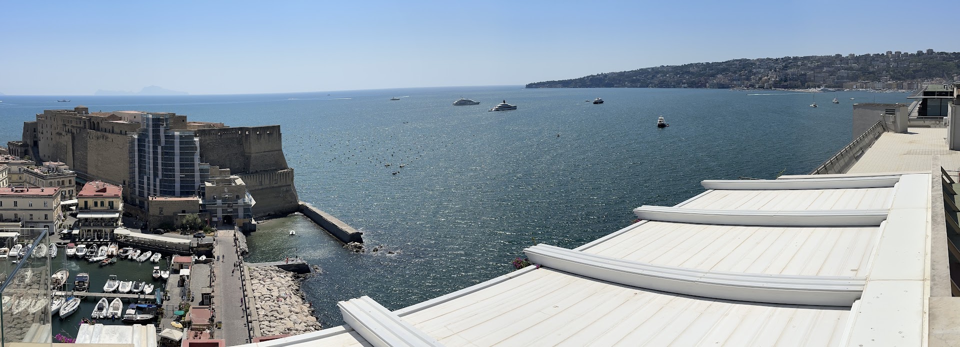 Stayed three nights in this magnificent hotel as our last stop before returning back to the USA after a three week vacation.|Needless to say, by the time we arrived, we were already running on empty, so we didn't have high expectations and were ready to wind down. But sometimes a destination can surprise you in a fantastic way and that is what Naples/Napoli did for us as soon as we arrived. This hotel gave us|just the right amount of jolt that we needed to enjoy our last few days from the moment that we checked in.||Although the hotel itself is pricey for Naples, it was a lot less than what we had already paid at|much higher priced Amalfi Coast locales. This almost felt like a steal compared to those. That said, I found the service to be impeccable. The people who worked at the rooftop Lounge, breakfast room and concierge were outstanding. I especially liked the woman who worked in|the breakfast room who|remembered how I liked my coffee (with a side of mimosa) and my room number |each day without me having to tell her. The hotel itself combines old world charm in the|hotel lobby with a modern cosmopolitan vibe in the rooftop lounge and restaurant. It's location sits right on a very picturesque section of the Bay of Naples with Sorrento to your right and Mt Vesuvius to your left. My room was the deluxe |sea view which was not large but spacious enough to store two large luggages very comfortably.|The bathroom also had ample counter space. And the shower, jacuzzi bathtub and bed were heaven.|The location by the waterfront had many restaurants by the sea that were pleasant and within 10-15 minutes walking distance to piazza de plebiscito where you could find tons of street food, gift shops and more trattorias. The Old historic town is easier to get to by taxi.. concierge can call it for you with fixed pricing but uber works here as well. It is also a convenient location to go on boat excursions but we preferred to enjoy the 5 star amenities by spending time|at the rooftop solarium with the |outdoor plunge pool and pizza and aperol spritz overlooking the bay. Afterwards, before heading out to dinner, the rooftop solarium transformed into a vibey lounge and perfect spot to catch the sunset.||I did not have dinner at the rooftop restaurant but heard the food is amazing. We were more interested in having our last bit of Napletano casual seafare than fine dining before heading back home.|My only disappointment, through no fault of the hotel, was the adjacent castle that is currently undergoing renovations and was covered with scaffolding so I was cheated out of the terrific views when the castle is lit up. I hope to come back once the repairs have been completed. I thoroughly enjoyed my time in Naples. I loved its grit, old world charm, authenticity and its people. Will definitely make this my go to place when I...