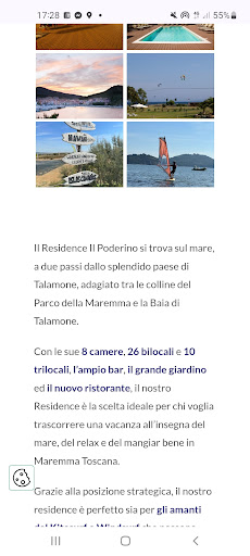 Read moreWir waren schon im vergangenen Jahr hier, da man hier normalerweise gute Konditionen für Kiter aufgrund der Thermik hat.||Diesmal waren wir 9 Tage da, das letze Mal 7 Tage. Wir hatten die Appartements 32 und 28, beide im ersten Stock und unweit voneinander entfernt. Man hatte einen schönen seitlichen Meerblick vom Balkon aus mit Blick auf Talamone. Vor uns war weite Grünfläche. Soweit so schön.||Wir wurden ganz nett empfangen. ||Das Appartement hatte eine Küchenzeile mit Blechbesteck Kochutensilien, Tellern, Gläsern, Töpfen, Plastikschüsseln, Pfannen und eine Mokkakanne, zwei Ceranfeldkochplatten, einen kleinen Ofen, in dem man Brot rösten konnte. Weiterhin gab es einen Kühlschrank ohne Eisfach.||Sofa und Betten quetschten, das Sofa war durchgelegen, die Matratzen schlecht - Kuhlen, die trotz Drehens der relativ neuen Matratze gleich wieder kamen. Ich musste nach zwei Tagen das dritte Bett benutzen, da ich schreckliche Rückenschmerzen bekam. Dieses Bett war etwas härter.||Das Appartement war weitgehend sauber. Es sollte während des Aufenthalts ein Mal eine Zimmerreinigung stattfinden. Erst einen Tag vor Abreise unserer neun Tage stand an der Türe eine Tasche mit frischer Bettwäsche und Handtüchern. Dies brauchten wir dann auch nicht mehr und selbst das Bett beziehen wollte ich für eine Nacht auch nicht. Im Schlafzimmer war im Gegensatz zum letzen Jahr auch ein Fliegenschutz im Fenster, was gut war.||Auf dem Balkon hörte man das all abendliche Entertainment-Programm vom Campingplatz nebenan und auch die Straße hörte man ein wenig.||Es gab seit diesem Jahr einen Aussenpool mit Liegen. Wer hierin schwimmen möchte, muss eine Bademütze tragen, die käuflich an der Rezeption für 2€ erworben werden kann, Stand August 18. Im letztem Jahr standen im Garten, der ganz nett angelegt ist, Plastikliegen, die gegen bessere Liegen ausgetauscht wurden. Es gibt Grillmöglichkeiten, was wir als positiv empfanden.||Wir hatten dieses Mal Frühstück inklusive. Es war in Ordnung, nur die Plastikschälchen mit Löffel und Gabel für das Müsli hätten nicht sein müssen - warum hier Plastik?! Das Yoghurt hätte gekühlt gehört.||Das Personal, das das Frühstück serviert hat, war sehr freundlich und zuvorkommend, das Restaurantpersonal am Abend war nicht freundlich und die Rezeption kann noch an sich arbeiten.||In manchen öffentlichen Bereichen, wie am Pool oder auf dem Balkon hatte man teilweise schlechtes, schwaches W-Lan. Man musste sich laufend neu einwählen.||Also, vom Preis-Leistung-Verhältnis zu teuer. ||Wer allerdings ausschließlich Wert auf Kiten, die Nähe zum Strand und den Blick vom Balkon auf Talamone legt, ist hier richtig aufgehoben .... Es ist ja eine Zwei-Sterne-Unterkunft. ||Aufgrund der Neuerungen im Gegensatz zum letzen Jahr und des Bemühens um Verbesserung und Aufwertung, noch drei Punkte.||Nach Talamone kann man am Wasser entlang in 20 Minuten zu Fuss laufen, nach Fonteblanda sind es 5km mit dem Auto zum nächsten kleinen Supermarkt.||Es gibt viele Gäste neben den Kitern und paar Surfern, die hier mit Hunden sind und Fahrrad. Hier kann man schön in der Natur...