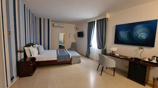 Abbiamo soggiornato per una settimana all'hotel Corte di Nettuno di Otranto, una struttura piacevole e accogliente che offre tanto e regala sensazioni di benessere e piacere. Appena varcherete l’ingresso capirete che il vostro soggiorno sarà speciale basterà guardarsi intorno per capire cosa intendo dire. La bellezza sia degli spazi interni che esterni e la cura nella pulizia saltano subito all’occhio, le camere con gli arredamenti in stile marinaro sono uno spettacolo, anche i pavimenti realizzati in tutta la struttura sono qualcosa di meraviglioso che non passa inosservato ed inoltre la gentilezza, la cortesia, la professionalità dell'ottimo personale della reception sempre proattivo e attento alle esigenze dei clienti non è cosa scontata ma frutto del sapiente e pregevole lavoro del proprietario dell’hotel, un noto imprenditore pugliese, che ho avuto il piacere e la fortuna di conoscere sul posto. Non manca un bel locale ristorante sempre molto particolare in linea con tutto il resto, si nota l’ottima supervisione del maitre che oltre a seguire con impegno e dedizione la cucina conosce molto bene il territorio e la sua storia, è stato piacevole scambiare quattro chiacchiere con lui che è sempre disponibile e mette passione in quello che fa. E poi c’è la sala interamente dedicata alla colazione dove troverete proprio tutto per una colazione sia dolce che salata con l’aggiunta di ottima frutta fresca di stagione e tanto altro, il personale che vi accoglierà è gentilissimo e molto attento a non farvi mai mancare nulla, ci vorrebbe una recensione a parte solo per descrivere l'abbondanza, la freschezza e la bellezza di tutto quello che ho visto su quella lunga tavola che viene rifornita continuamente. Al piano terra c’è una bellissima e comodissima corte esterna dove potrete ammirare una grande statua del Dio Nettuno, lì potrete semplicemente rilassarvi o anche fare colazione se preferite consumarla all’aperto. In questo hotel anche recarsi nella propria camera non è una cosa banale, io per esempio preferivo salire a piedi e non usare il comodo ascensore per non perdermi la bellezza di tutti gli oggetti posizionati con criterio e nesso logico, parlo di pezzi unici antichi e anche più recenti, oggetti che hanno a che fare con il mare e che fanno parte di una meravigliosa collezione che il proprietario ha voluto nel suo albergo un vero e proprio museo marino fruibile a tutti. Devo dare risalto anche ad un altro aspetto molto importante legato alla logistica, la posizione dell’hotel è a dir poco strategica in quanto sarete a due passi dal porto (ogni mattina una tappa fissa per smaltire l’abbondante colazione 😊) e a meno di 5 minuti a piedi dal bellissimo centro di Otranto e dal Castello Aragonese. Inoltre, la presenza di un parcheggio riservato proprio di fronte all’albergo è un valore aggiunto irrinunciabile vista anche la posizione dello stesso proprio sulla strada che porta verso le provinciali a scorrimento veloce che vi consentiranno di raggiungere tutta la miriade di luoghi limitrofi che vorrete visitare, in primis la meravigliosa strada litoranea che arriva fino a Santa Maria di Leuca. Vorrei parlare ancora della terrazza dove poter prendere il sole sui lettini (c’è anche una bellissima e utilissima doccia), dei deliziosi salottini sistemati a piano terra e ai piani superiori ma penso che sarebbe impossibile poter descrivere tutto con la precisione che merita avendo a disposizione solo una recensione. Tengo a precisare però che è la prima volta che sto così bene in un albergo, dico solo che alla sera ero felice di rientrarci anche se questo voleva dire che la mia giornata trascorsa alla scoperta di Otranto era già finita. Amo Otranto ed ora amo anche il Corte di Nettuno, farò di tutto per poterci tornare...