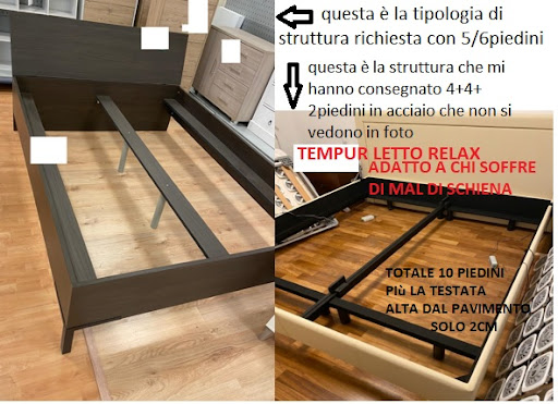 PESSIMO-mi hanno venduto un materasso fuori produzioni HYBRID SUPREME H 21:dicendomi che aveva 5cm di materiale tempur, ho scoperto solo dopo che ne aveva solo3cm, ha le molle ed è fuori produzione PESANTISSIMO-mi sono lasciata convincere a comperare anche il letto Specificando la richiesta di un letto matrimoniale con 5piedini al massimo 6 come in foto e invece mi hanno consegnato una sala Bowling-delle reti non mi hanno consegnato i ferma materassi testa piede e laterali - non mi hanno consegnato il kit ferma materassi ...ma i soldi se li sono presi ...