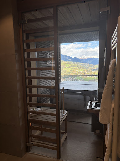 Then there is the Heaven and Hell wellness area, an architectural poem in contrasts. Suspended between worlds, it invites guests to journey through warmth and chill, elevation and descent, three jacuzzis at 36 °C mirrored against saunas and a cold rain shower below. Our private jacuzzi experience was, in every sense, unforgettable. The sequence, shower, sauna, jacuzzi, framed by that impossible mountain view, is unlike anything we have ever encountered. It is both romantic and elemental, an intimate immersion in the poetry of contrast.